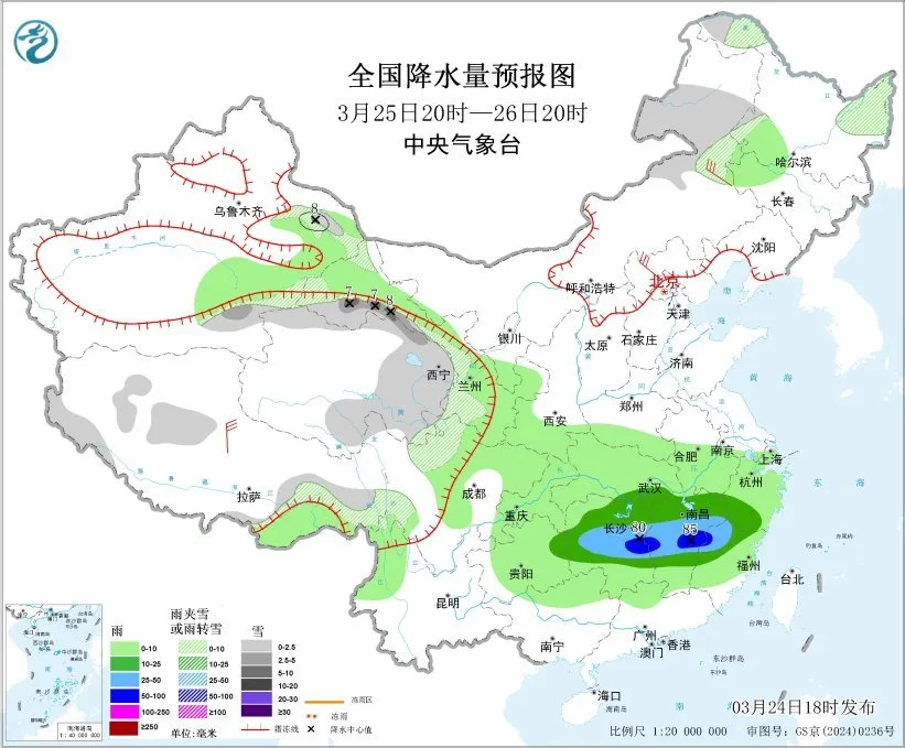 图1 全国降水量预报图(3月24日20时-25日20时)