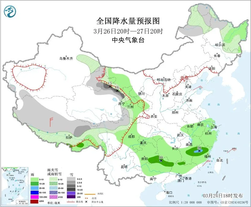 3月24日20时至25日20时,新疆北部和沿天山地区、西藏北部和东部、青海大部、甘肃南部、川西高原中北部、黑龙江西北部等地部分地区有小到中雪或雨夹雪,其中,新疆沿天山地区、西藏东北部、青海东南部、甘肃南部等地部分地区有大到暴雪,局地大暴雪(20~25毫米);新疆南疆盆地、西藏东南部、四川东部和南部、云南中北部、贵州、湖北西南部、江南西部、华南北部、浙江东部、福建东部、台湾岛中东部等地部分地区有小到中雨,其中,西藏东南部、贵州南部、湖南西南部等地部分地区有大雨,局地暴雨(50~55毫米)。内蒙古中部、东北地区东部、川西高原北部、山东半岛等地部分地区有4~6级风,新疆北部和沿天山地区、西藏北部等地部分地区有6~7级风,新疆沿天山地区部分地区有7~8级风;东海北部将有6~7级风,阵风8级(见图1)。