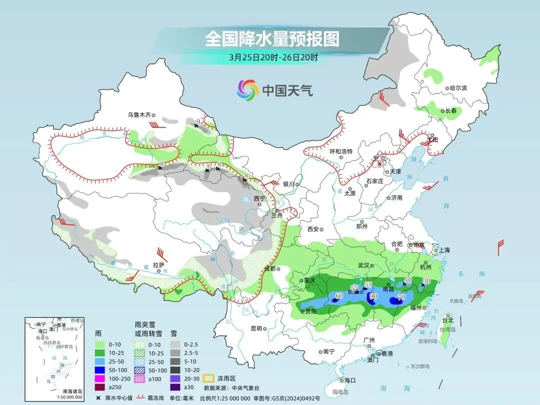 25日夜间,贵州中南部、湖南中部、江西中部有中到大雨,局地将有暴雨,或伴有短时强降雨等强对流天气;26日白天,随着急流东移,江西中部、福建北部将有中到大雨,局地暴雨。