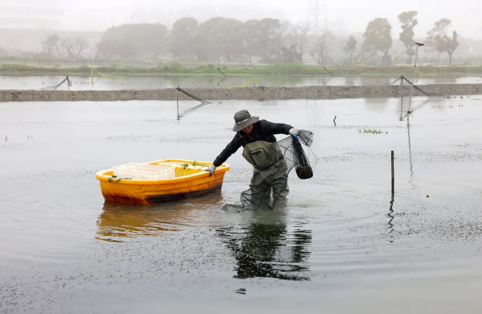 温州网讯 3月25日上午,温州市瓯海区仙岩街道岩二村稻虾共作基地里,当地的养殖户正在水田里忙碌着,将钻进捕虾笼里的小龙虾捞上水面。