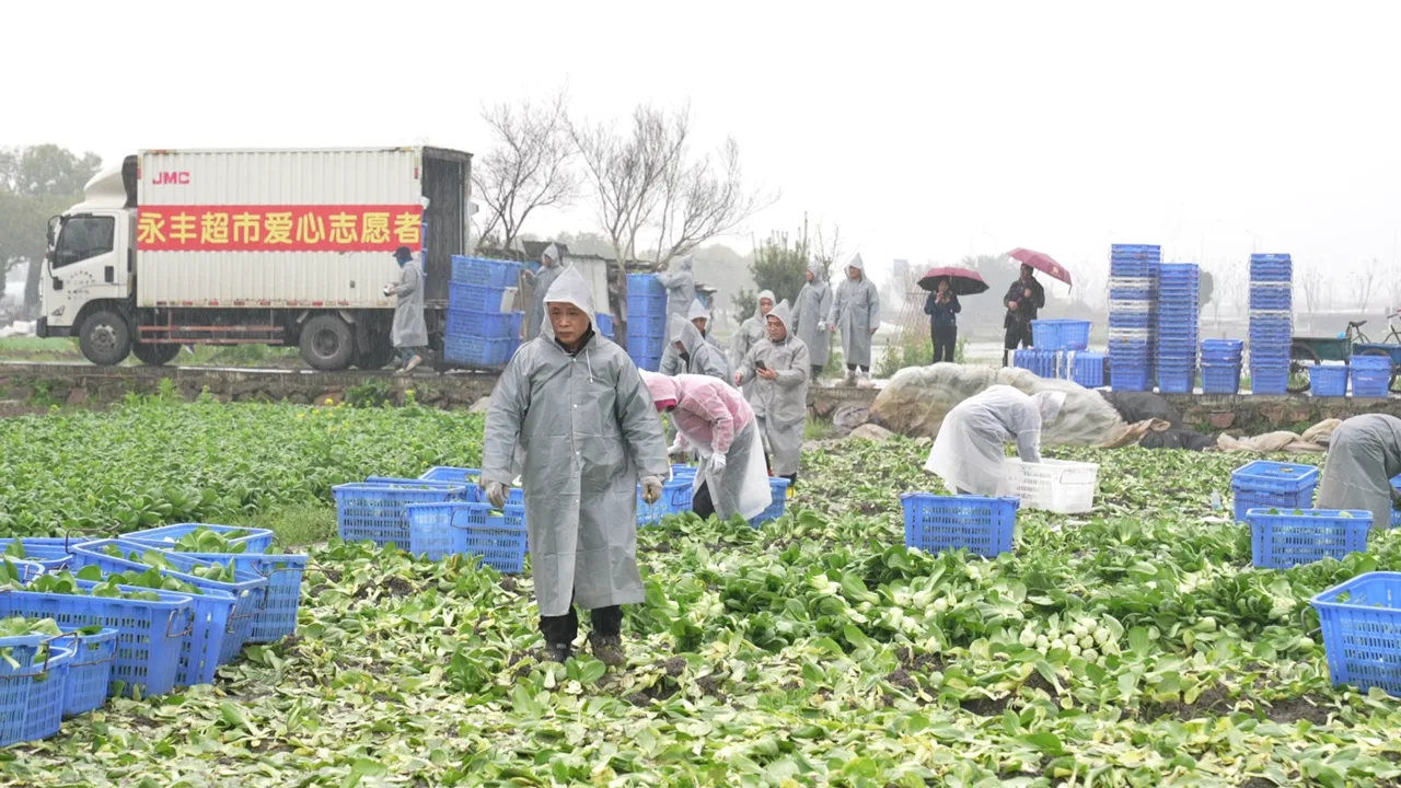 温州永丰超市生鲜采购部总监助理唐宗勤,早上6点多就带着20多名员工赶到地里。“昨天看到新闻后,我们第一时间取样检测,青菜各项指标均合格。”他们自备货车、菜筐,抵达后立刻投入采收。“大雨天,几名员工滑倒摔了,但大家依旧坚守岗位。”唐宗勤说,只要条件允许,超市愿意把剩下的青菜全部收购。