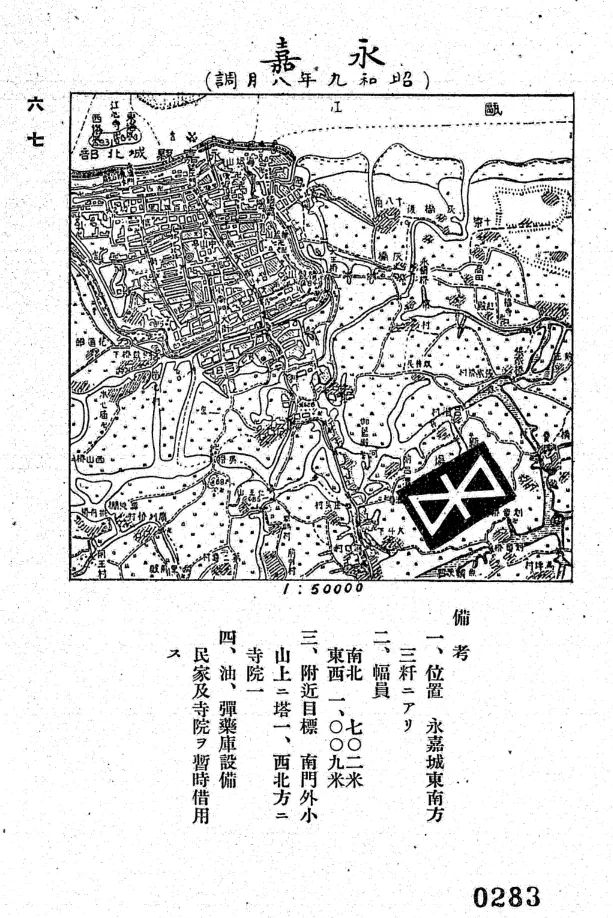 永嘉(南塘)机场图,昭和九年(1934年)八月调查,原载日军参谋本部编《支那飞行场全图》,第67页。