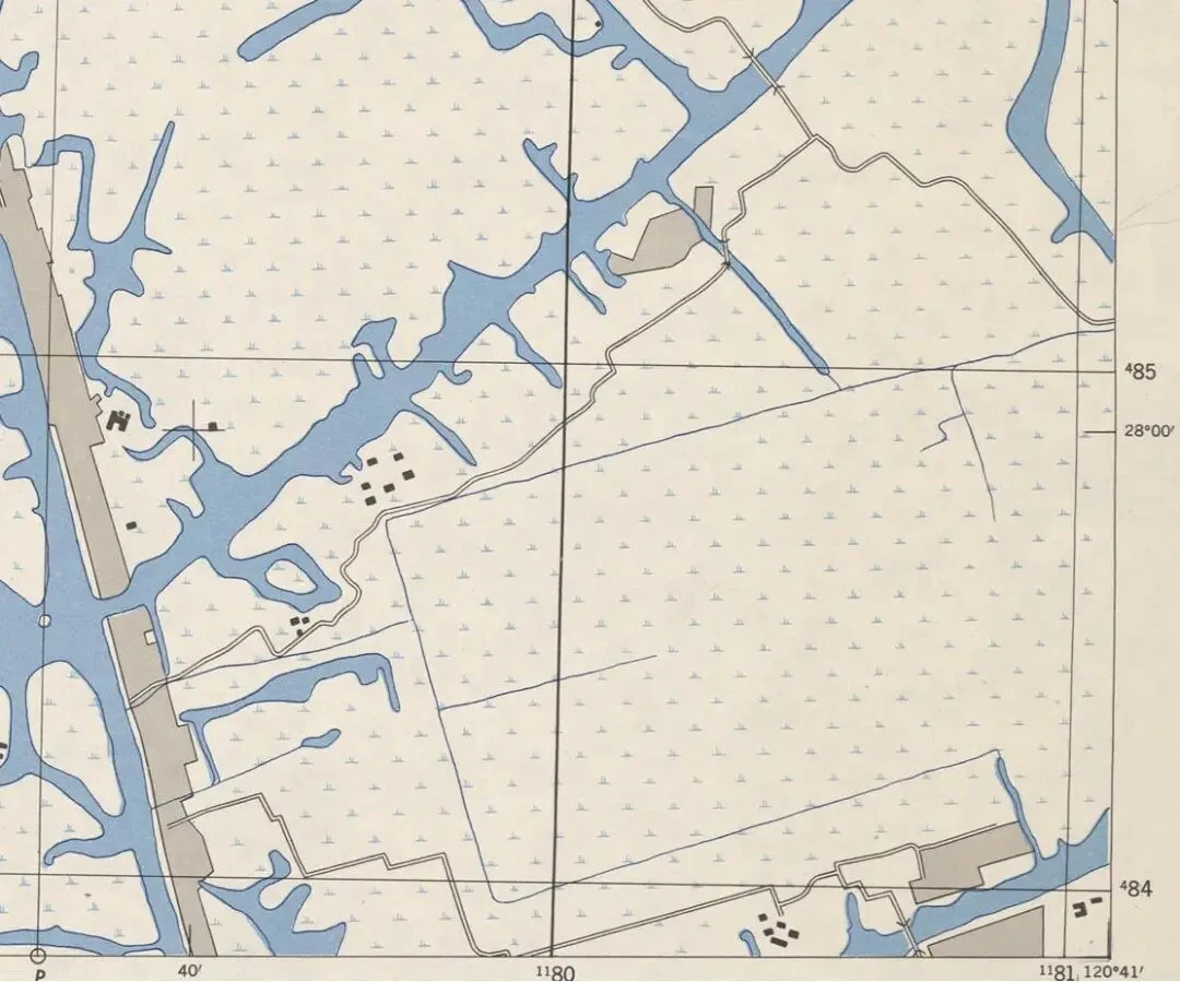 将卫星图中机场界线加红后突出显示(如上图),这与美军1945年测绘的温州地图的对应部分完全吻合(如下图)。