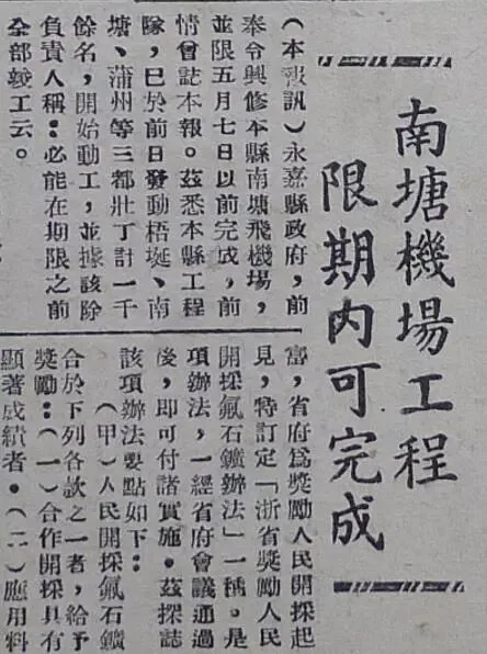 《南塘机场工程限期内可完工》,《浙瓯日报》1949年4月30日,第3版。
