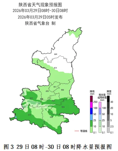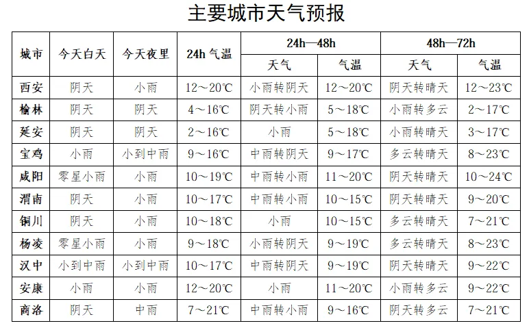 30日:全省阴天,陕北小雨(0~5毫米),关中、陕南小到中雨(2~25毫米),宝鸡西部局地、秦岭西段有雨夹雪或小到中雪(0~5毫米)。陕北西部及北部局地有霜冻。