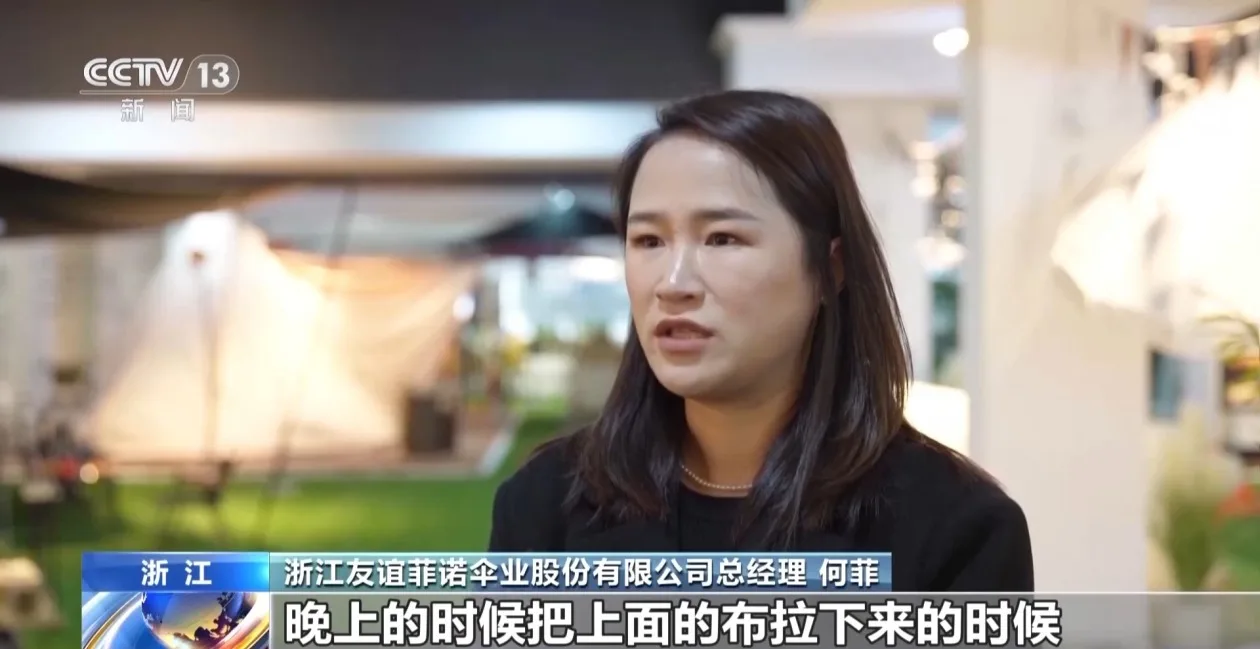 浙江友谊菲诺伞业股份有限公司总经理 何菲:晚上把上面的布拉开,就可以看到天上的星星。它还有外帐,可以完全封闭起来,满足过夜需求。消费者已经不再是随便搭个地毯就玩一天。