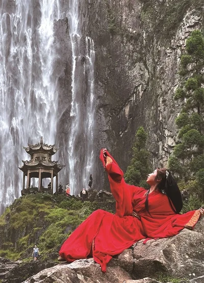 百丈漈,游人拍摄武侠风。