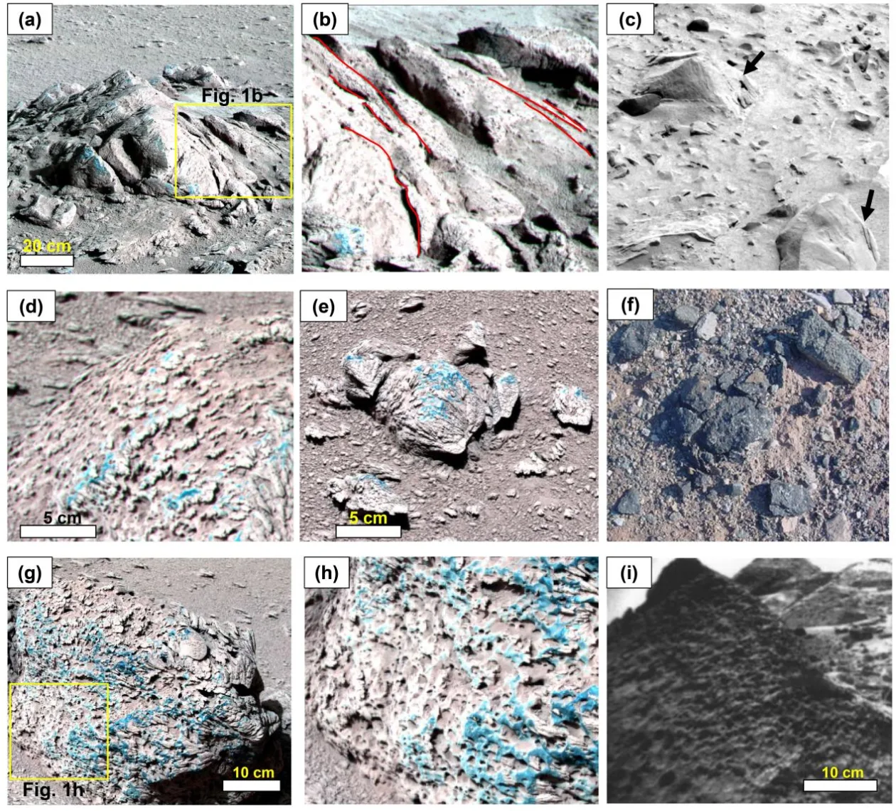 △图1:祝融号拍摄石块(前两列)与其他火星车和地球石块纹理对比(第三列)