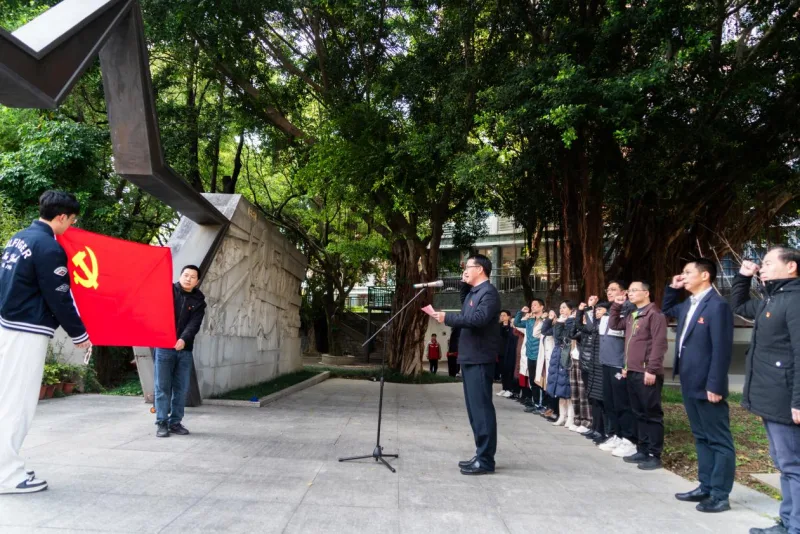 党委书记带领党员代表在学校英雄墙前重温入党誓词。