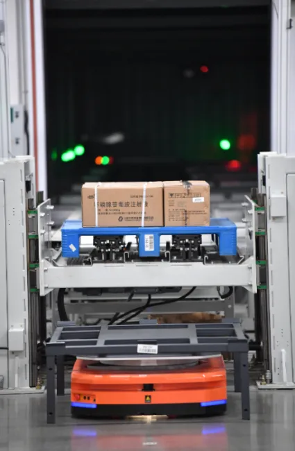 3月13日,智能搬运机器人在咸阳医药工业集团现代物流仓搬运药品。新华社记者 李一博 摄
