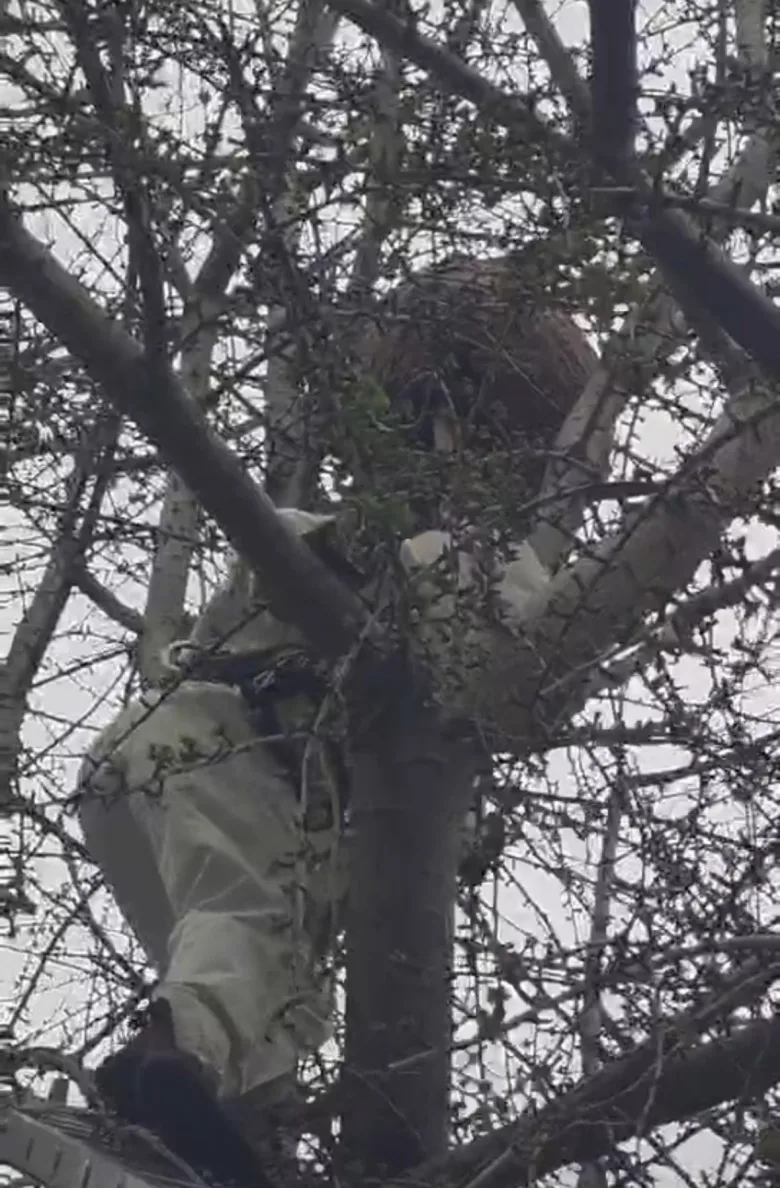 马蜂窝嵌在十余米高的树杈分叉处,位置险要,操作空间狭小。消防指挥员现场研判后决定,决定启用15米金属拉梯作为核心装备,以人工攀登实施精准摘除。4名消防员分工协作,两人稳固梯脚,两人托举梯身,逐档攀升固定。一名消防员身着厚重防蜂服,沿梯稳步登高,到达位置后迅捷将蜂窝连根摘除,随即喷洒药剂驱散蜂群。