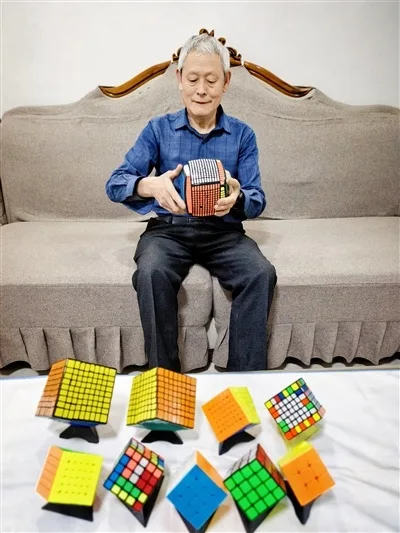 60岁那年,孙子从学校带回一盒魔方,重新勾起了他的好奇心。他拜孙子为师,又请女儿帮忙借阅相关资料,一门心思钻研魔方,越玩越上瘾。三阶、四阶、五阶、六阶……一路升级,一直玩到九阶魔方。