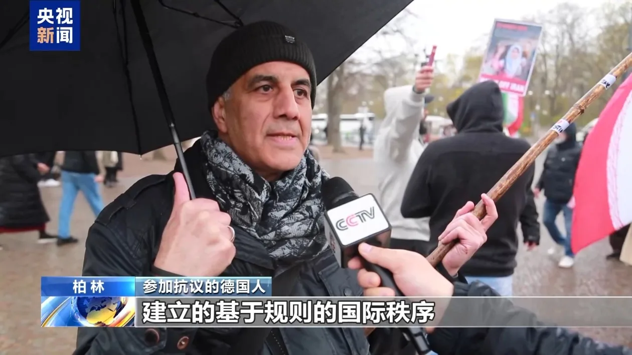 参加抗议的德国人:美以对伊朗发动的是一场非法的侵略战争,这违反了《联合国宪章》,必须立即停止。否则将违背1945年二战胜利后建立的、基于规则的国际秩序,并将导致人们重回丛林法则的世界。