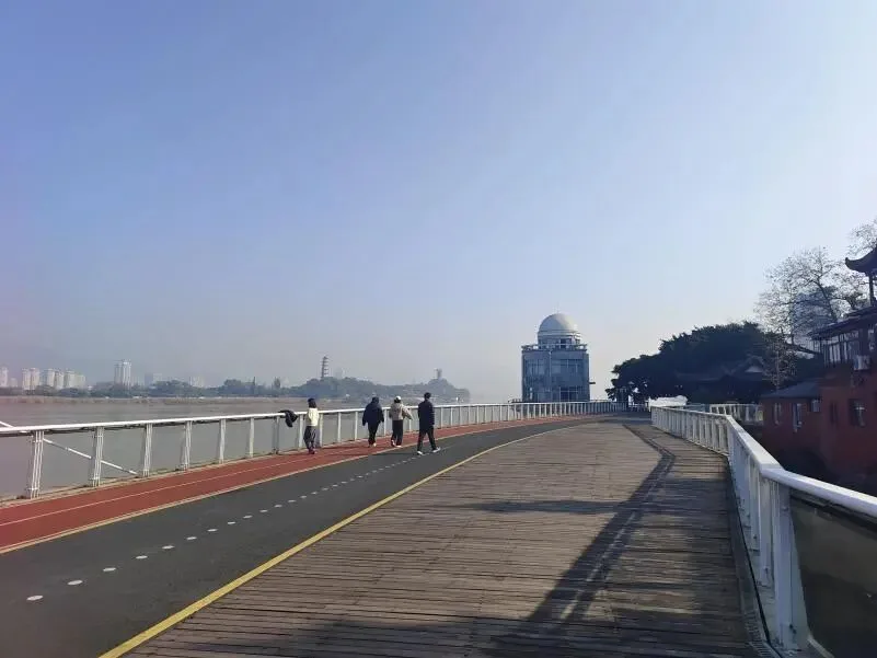 沿江绿道是市民日常散步、跑步的主要通道。原有的木地板铺装,经过多年风吹日晒,部分区域出现腐烂、翘起等问题,既影响美观,也存在安全隐患。本次将木质铺装更换为流线型蓝色渐变彩色沥青,与瓯江水面遥相呼应,形成“蓝道”视觉意象。新铺装平整舒适、防滑耐磨,无论是散步、慢跑还是轮椅通行,都更加顺畅安心。