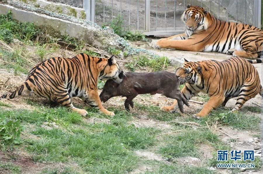 两只华南虎在梅花山散放区捕食。新华社记者林善传 摄