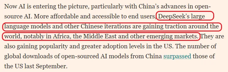 在人工智能领域,文章提到,以DeepSeek为代表的中国开源大模型正不断扩大海外影响力。凭借更低的成本与更易获取的使用门槛,中国大语言模型在非洲、中东等新兴市场受到广泛关注。文章称,相关模型应用增加后,可能进一步带动预测性维护、数据分析和智慧基础设施管理等服务需求,从而对知识密集型服务出口形成支撑。