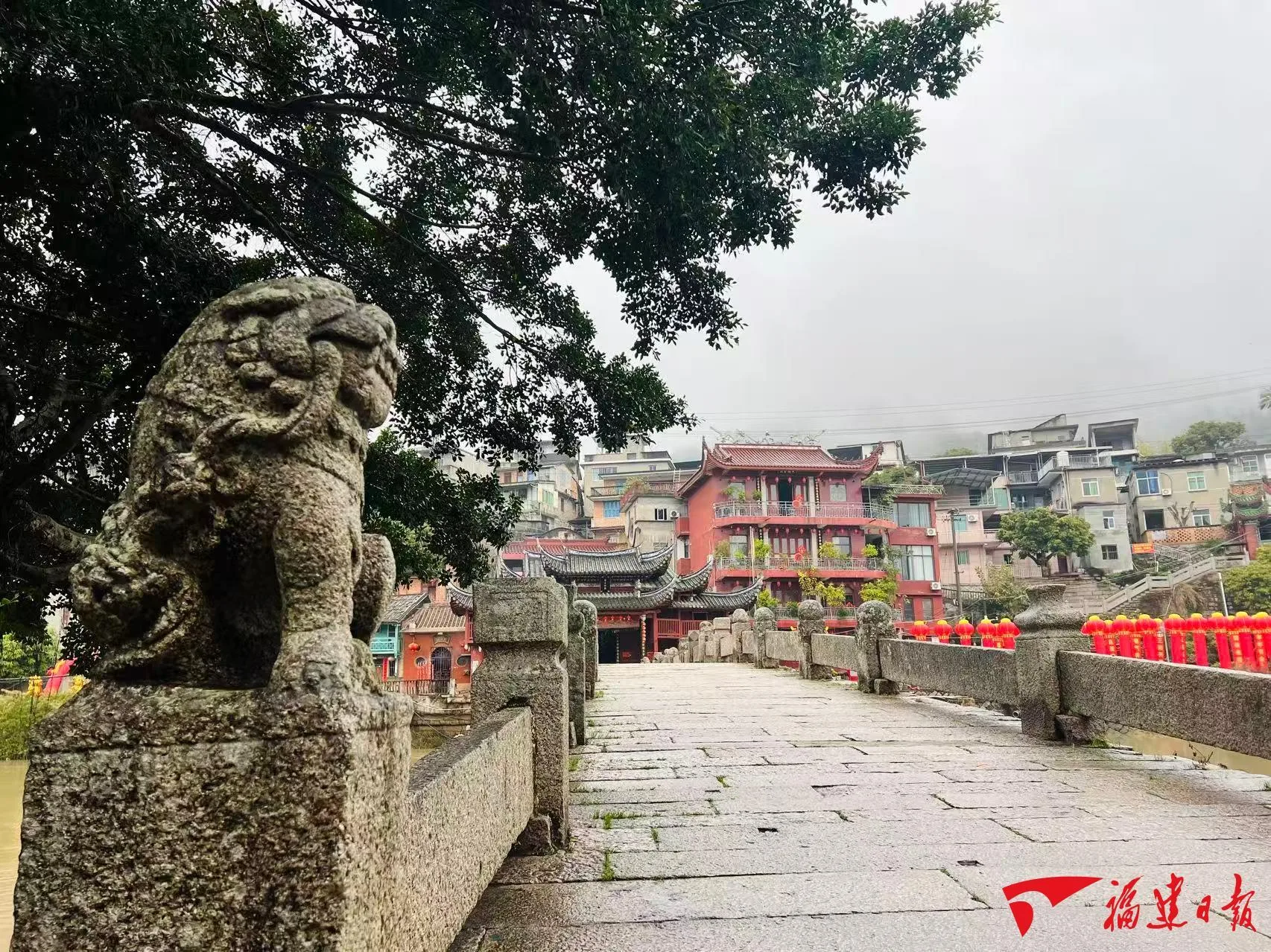 迥龙桥两端,玄帝亭与圣王庙静静矗立,与石桥共同构成独特的“桥庙相依”古景。北端是圣王庙,背靠棋盘山,由跨街亭、圣王殿、观音阁三部分组成,古色古香。圣王庙见证着闽台之间深厚的历史渊源。
