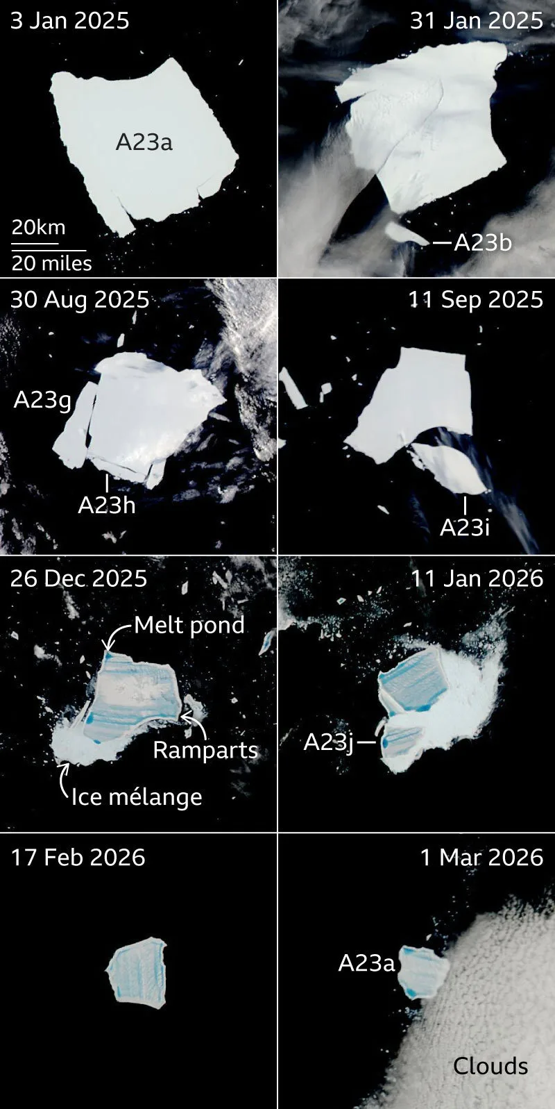 2025年,A23a的消融速度进一步加快,这一年当中它的面积减少了60%。2025年6月至9月,A23a发生多次大规模断裂,面积迅速缩减至约1400平方公里。