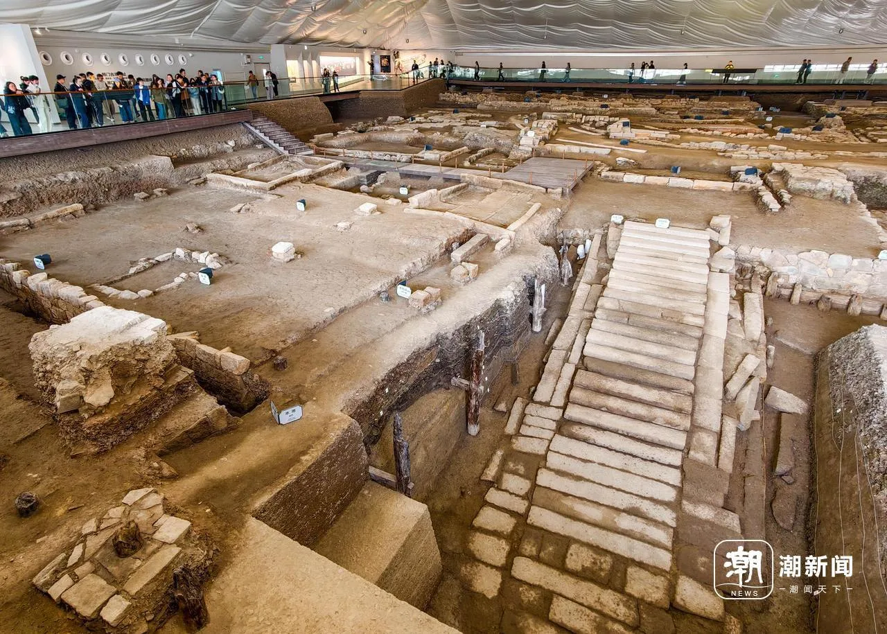 步入遗址展示馆的旋转门,“斗转千年”的仪式感油然而生。特制旋转门可稳定棚内气压、减少空气对流,轻轻一推,便从当前“跨进”千年之前。温州市文物考古研究所所长梁岩华告诉记者,遗址展示馆作为核心保护展示建筑,采用“轻、快、稳”气膜结构,自重轻、搭建快,不需要柱子,不会对遗迹本体造成侵扰,同时通过可调控温湿度的内部环境为遗迹提供“安稳的家”。环顾四周,码头、沉船、栈道、瓷片堆静静躺在那里,与现代城市隔窗相望。展示馆内四大展区由内而外自然延伸,与户外遗址群全景联动。7号、9号码头的地层叠压遗迹清晰可辨,唐代、宋代、元代、明代、清代,一层又一层,仿佛一部翻开的史书。AR屏幕生动还原了码头当年的营建方式和使用场景,正是“科技赋能”的生动体现。