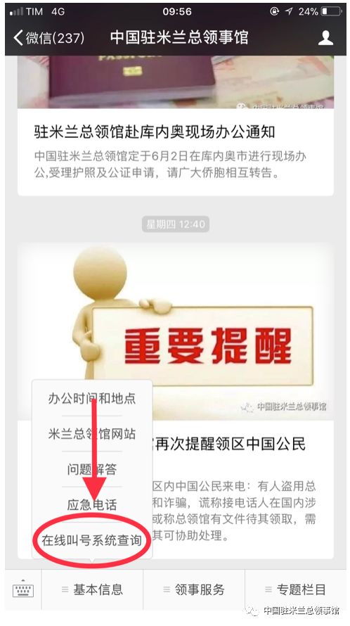在线叫号系统上线后,申请人来馆办证或取证均应在“取号处”取号并凭号办理。申请人可以通过办证大厅两块显示屏查询各窗口办理进度,也可添加我馆微信公众号“中国驻米兰总领事馆”,在“基本信息”项下的“在线叫号系统查询”栏中随时查看办理进度(二维码及具体操作附后)。