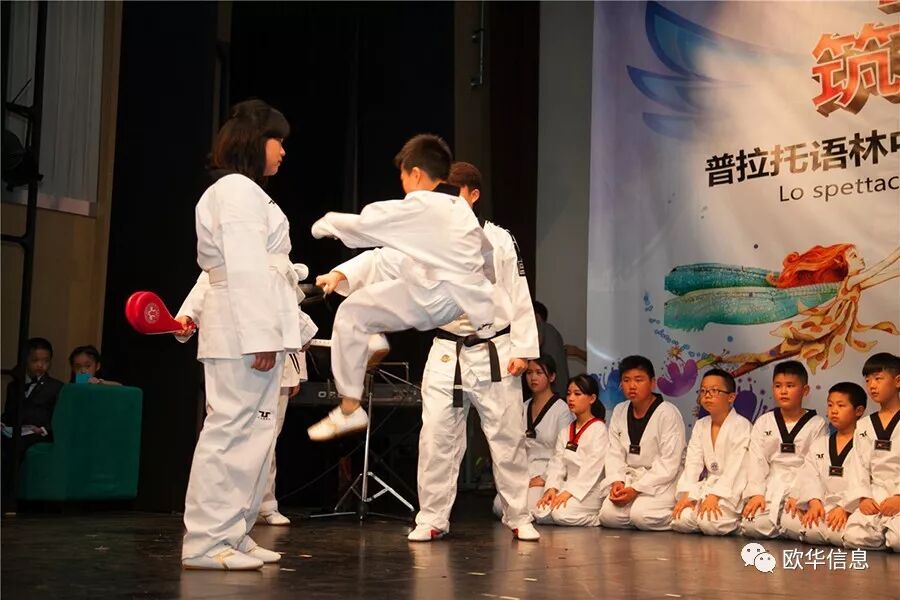 演出中,精彩节目轮番上演,异彩纷呈。国学经典诵读《大学》展示了悠悠千载的中国文化。跆拳道班的同学们为大家带来的《跆拳道表演》以其变幻莫测,优美潇洒的腿法赢得了阵阵掌声!难怪跆拳道被世人称为踢的艺术,这是跆拳道区别与其他格斗术的一个重要特点。 2年级和四年级班带来的少儿武术和功夫扇更是展现了中国武术的博大精深,传承了中华国粹。随后的啦啦操表演《shake it off》、舞蹈《魔法少女》、歌伴舞《最美的光》给大家展示了小朋友们青春活泼的一面;小品《语林社艺考》,构思巧妙,包袱不断,富有很强的感染力;小歌手把《如果有来生》诠释的淋漓尽致,唱出了明星范儿;学生原创多语种翻译歌曲《追光者》赢得了现场观众的一致好评。伞舞《风筝误》动作编排与音乐完美的融合,媚而不俗,彰显舞者的魅力。诗歌朗诵《我长大了》以动人心弦、催人泪下的叙述情节感动了无数的观众。由语林中文学校合唱团带来的杯子打击乐《稻香》更是惊爆全场,用纯人声无伴奏合唱和杯子敲打的方式,完美演绎了一首《稻香》,不仅刷爆网络朋友圈,更是被评论为:“神作”。 台下看完这个表演的一些观众小朋友,只想问一句:老师,本00后现在重新到语林中文学校报名还来得及吗?
