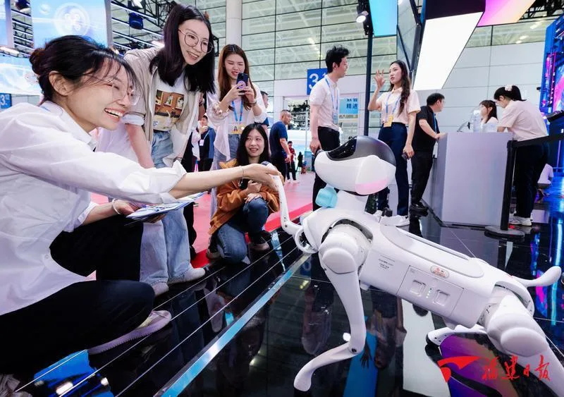 2026年4月28日,在第九届数字中国建设峰会展会现场,中国移动展区的机器狗正在和人进行肢体互动。这款四足机器狗是中国移动具身智能产业创新中心自主研发的运营商首款四足机器人产品,集成高可靠环境感知、多模态智能驱动、仿生机动运控、动作编排创作等关键技术,融合自然语言理解、视觉精准认知、智能仿生行为、敏捷机动运动等能力,目前在居家/外出陪伴、文化展演、科技助残等多元场景已有广泛应用。林晓烨 摄