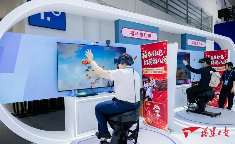 2026年4月28日,在第九届数字中国建设峰会展会现场,观众带着VR眼镜,骑在智能马鞍上,伸出手沉浸式体验游戏内容。“福马接红包 幻骑游八闽”是网龙展区的VR沉浸式体验项目。体验者佩戴高清VR设备、跨上智能马鞍,即可“骑马” 幻游福建。项目融合高精度无人机扫描、3D建模、空间定位、感官反馈及数宇人等前沿技术,将游戏化脚本与福建文旅资源深度结合,带来多维感宮刺激与沉漫式文旅体验。林晓烨 摄