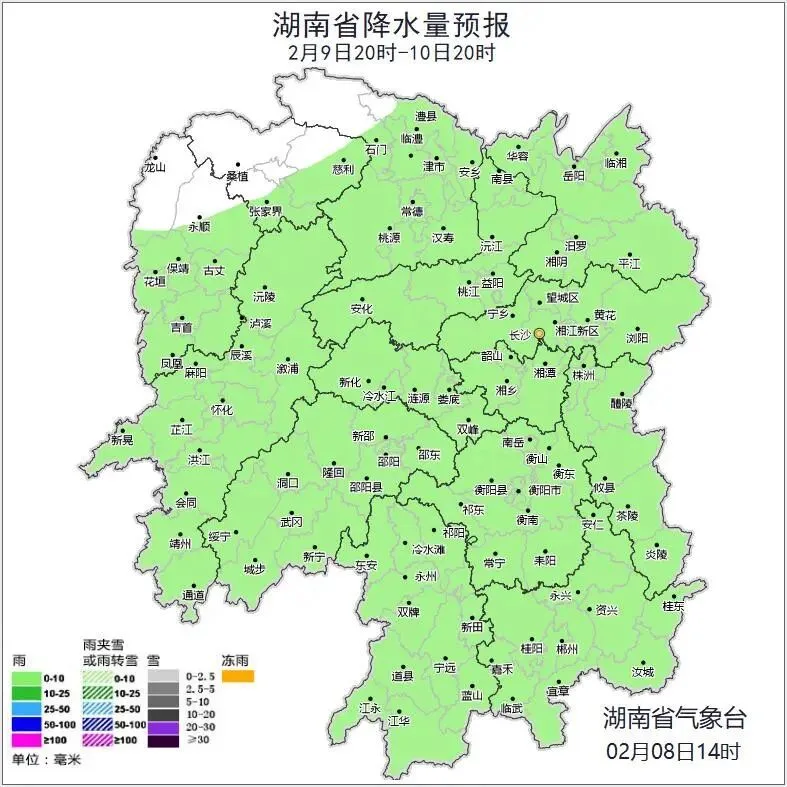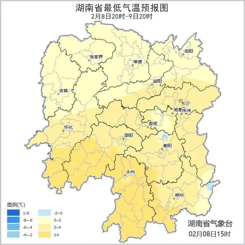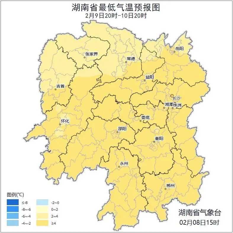 9日晚上至10日白天,湘中以北小雨转多云,其他地区阴天有小雨;北风2~3级;最低气温湘西北1~3℃,其他地区4~7℃;最高气温湘西北、湘东南12~16℃,其他地区8~11℃。