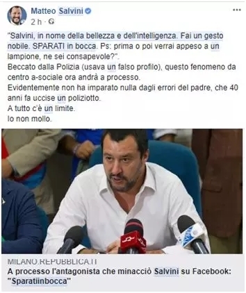 18日,萨尔维尼在其脸书上评论道:“他(指涉嫌诽谤自己的男子)的父亲在40年前还杀死了一名警察。很明显,他没从他父亲的错误里学到什么。”