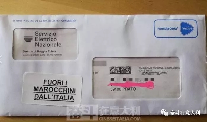 据意大利媒体报道,奋斗在意大利编译:近日,在普拉托,大量摩洛哥居民举报,他们收到的国家电力公司信函上醒目位置用大写字母写着“FUORI I MAROCCHINI DALL'ITALIA”(摩洛哥人离开意大利)。