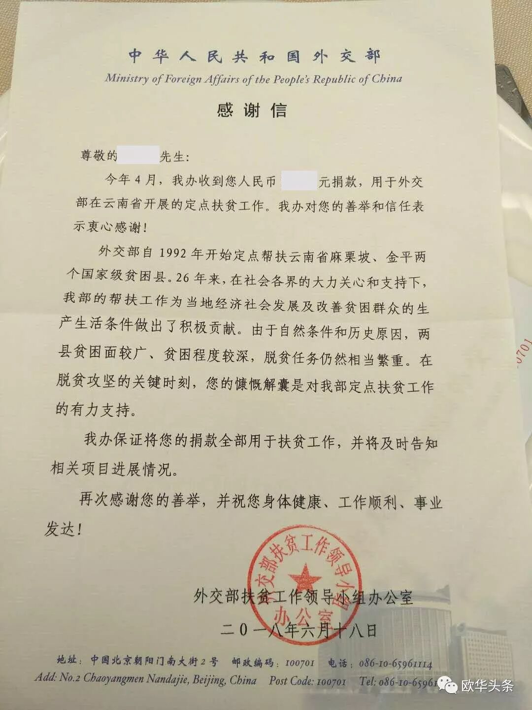 根据党中央、国务院扶贫开发战略部署,外交部自1992年开始定点帮扶云南省麻栗坡,金平两个国家级贫困县。26年来,已在上述两县实施1400多个扶贫项目,惠及30多万人口,推动当地上学难,就医难、行路难、饮水不安全等问题得到逐步缓解,为配合国家整体扶贫开发战略做出了积极贡献。外交部的有关工作,得到了各有关方面、包括海外侨胞的大力支持。