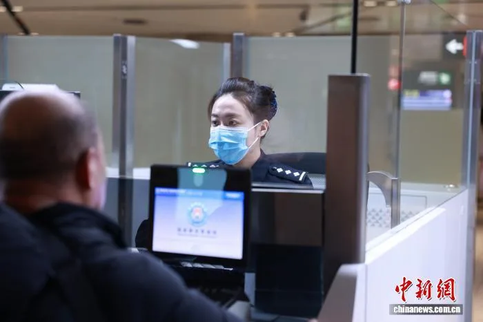 哈尔滨出入境边防检查站移民管理警察为入境旅客办理通关手续。 陈尚楠 摄