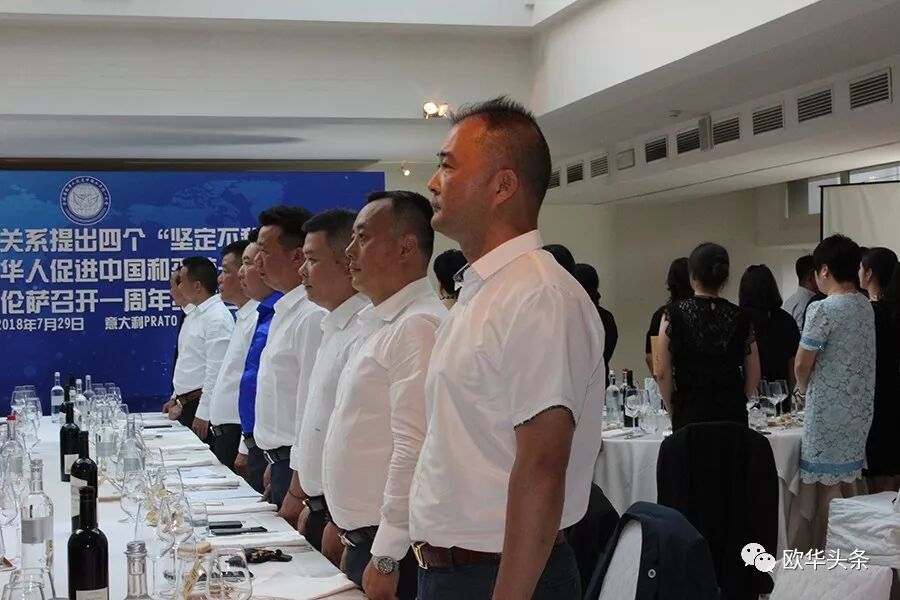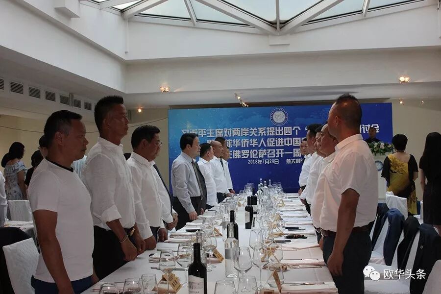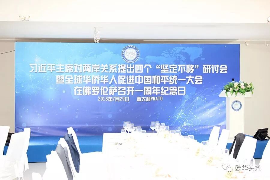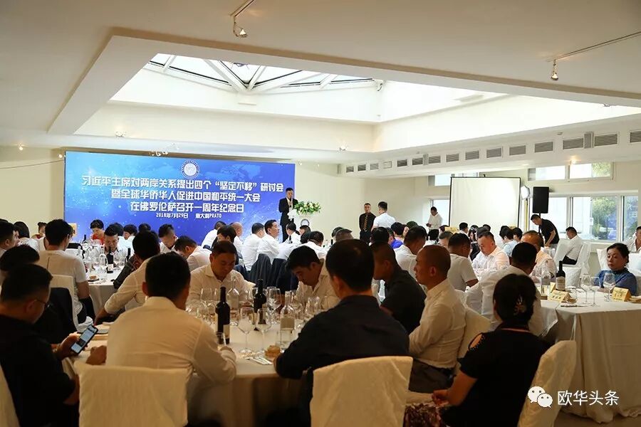 意大利《华人街》讯(记者一策):2018年7月29日晚,习近平主席对两岸关系提出四个“坚定不移”研讨会暨全球华侨华人促进中国和平统一大会在佛罗伦萨召开一周年纪念日,于意大利普拉托的Wallart酒店举行。傍晚七点左右,嘉宾纷纷到场并就坐,中国驻佛罗伦萨总领馆王辅国总领事及中部领区各侨社代表、华文媒体上百人出席大会。意大利中国和平统一促进会秘书长叶慧明宣布大会正式开始。