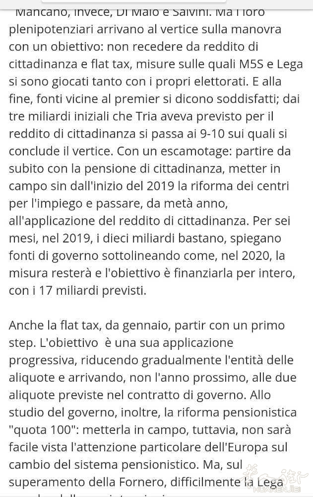 从明年1月开始,单一税制也将从第一步开始。目标是逐步实施,逐步减少税率的规模,并最终实现政府合同规定的两种费率,而不是明年。此外,当政府正在研究“100配额”养老金改革时,预期在欧洲特别关注下,改变养老金制度并不容易。但是,在废除Fornero退休法这一点,联盟几乎没有退让意图。(意米阳光)