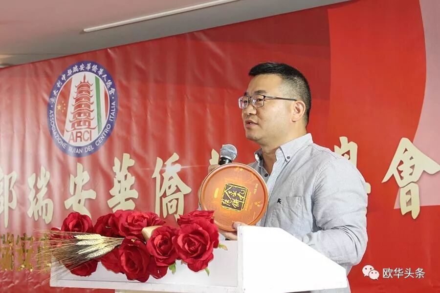 ▲欢迎会由意大利中部瑞安华侨华人总会秘书长金毓松主持,感谢代表团一行从家乡带来的月饼,并提前祝愿所有同胞度过一个愉快的中秋节。