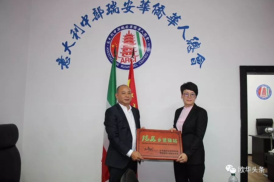▲瑞安市委常委、统战部长郑海洁亲自向意大利中部瑞安华侨华人总会授予“瑞安乡贤驿站”站牌,希望这里能够成为所有瑞安人共同的家。
