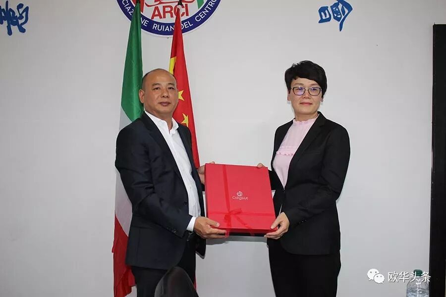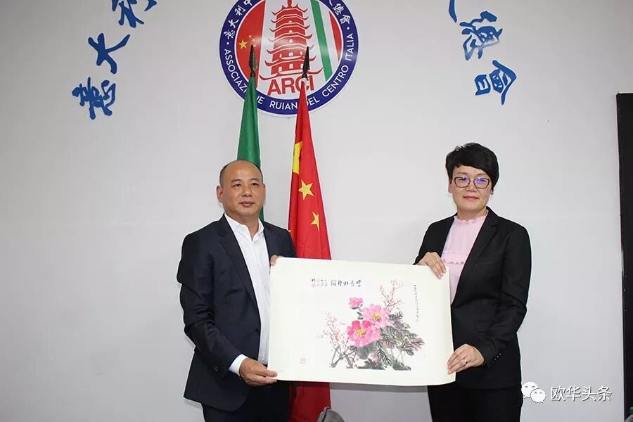 ▲意大利中部瑞安华侨华人总会会长丁金荣向瑞安市政府代表团赠送纪念品留念。
