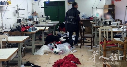 第一家工厂位于Poggiomarino,当时在检查中税务警察发现里面有17名工人在做工,其中2人是属于非法移民,老板被提出涉嫌非法协助移民行为和雇佣黑工。
