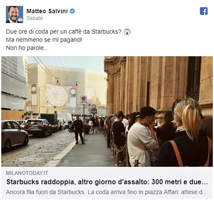 平日热衷于晒意大利美食的副总理萨尔维尼(Matteo Salvini)也评论道:“排两个小时的队去喝星巴克?真是无语!他们给我钱,我都不去!”