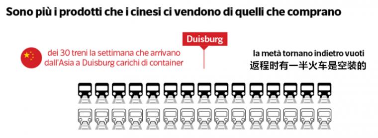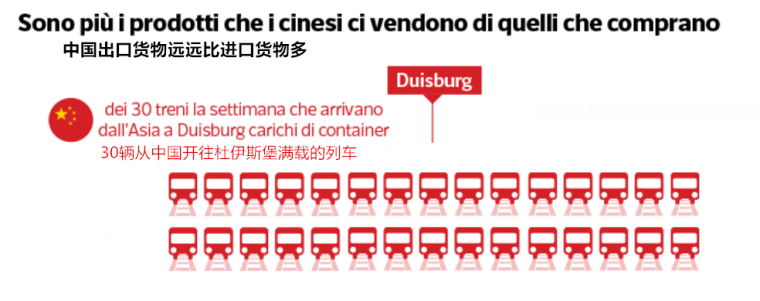 这将是一个超大的大陆贸易。但与此同时双方还存在着极大的贸易差,今天中国卖给欧洲的东西远比他们买的多,30辆开往杜伊斯堡的列车,有一半拉着空车返程。