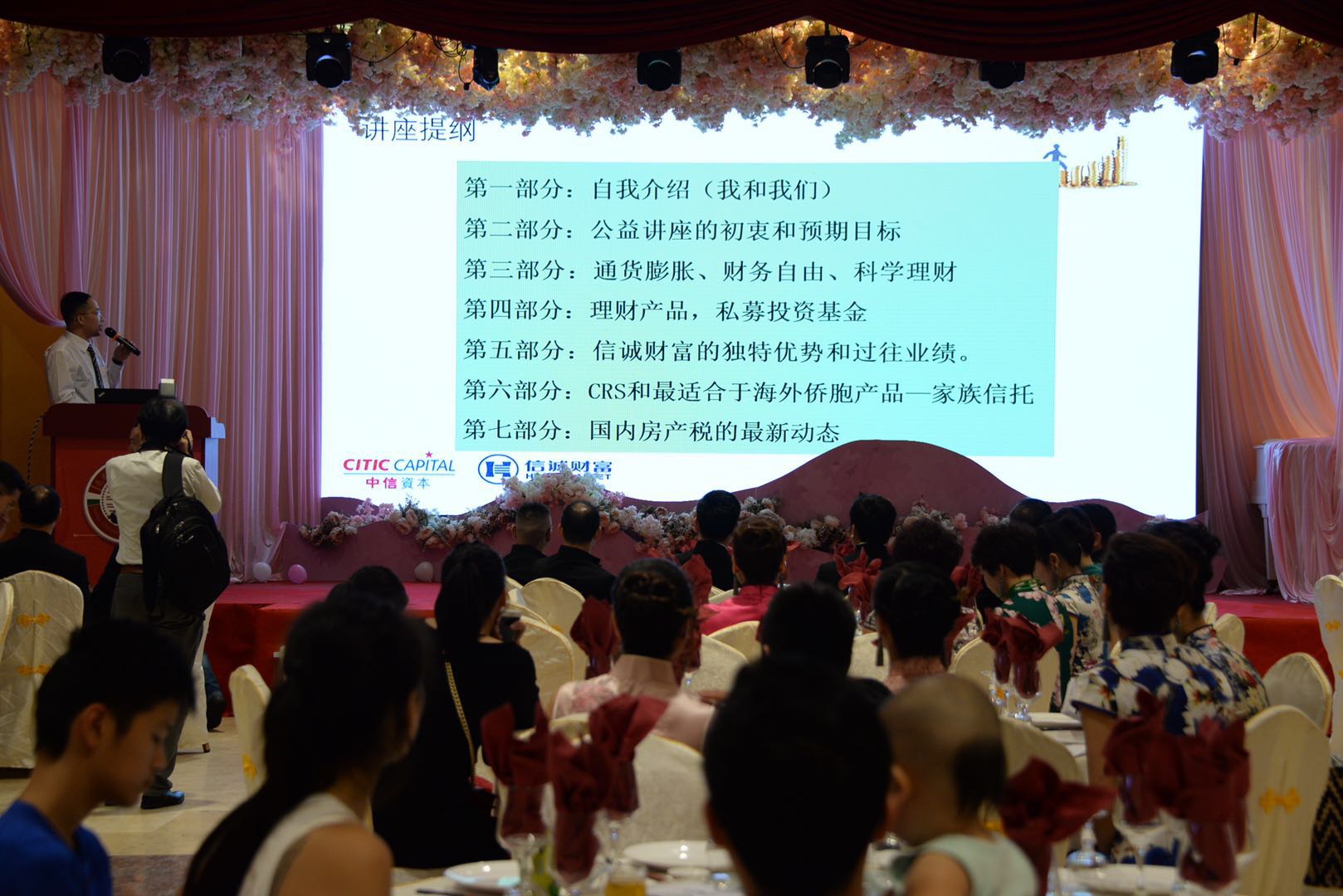 此次讲座是相应浙江省委、省政府提出的“浙商回归”、“华侨要素回归”两大工程,为了体现国有企业社会责任,中信集团旗下信诚财富为广大海外侨胞精心准备的纯公益性理财知识讲座。陈海鸥先生为在意华企老板量身准备了一套公益讲座,利用PPT深入浅出地让大家了解和懂得理财的概念和必要性。陈海鸥先生此次讲座的主题分为:1公益讲座的初衷和预期目标。2 通货膨胀,财务自由,科学理财,三者之间的辩证关系。3常见理财产品和私募投资基金。4讲述优质高端财富管理平台的主要特征:国有参股、持牌经营、专业合规、集团优势。5重点介绍为应对CRS(全球共同税务汇报标准),特地为海外侨胞打造的产品“家族信托”。6国内房产税最新动态。