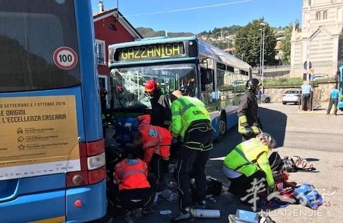 简讯报道:09月24日Bergamo(贝加莫)的Gazzaniga市中心一所学校门口两辆公交车发现相撞,导致2名学生受伤和1名学生死亡。