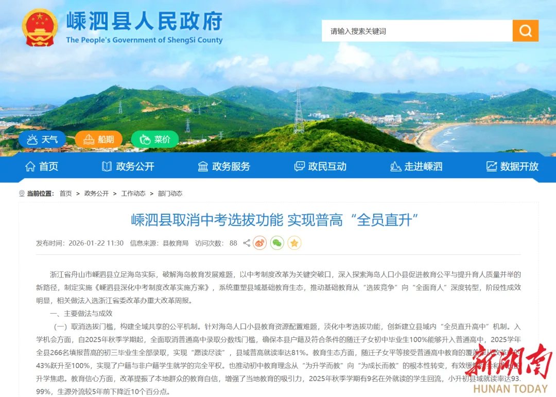 为什么这么做?嵊泗县是个海岛县,常住人口才6万多,去年新生儿只有148个,初中毕业生一年也就300多人,县里唯一的高中——嵊泗中学的学位已能基本覆盖。这种情况下,如果还硬要通过中考分数来“卡人”,只会放大竞争,加剧“内卷”。