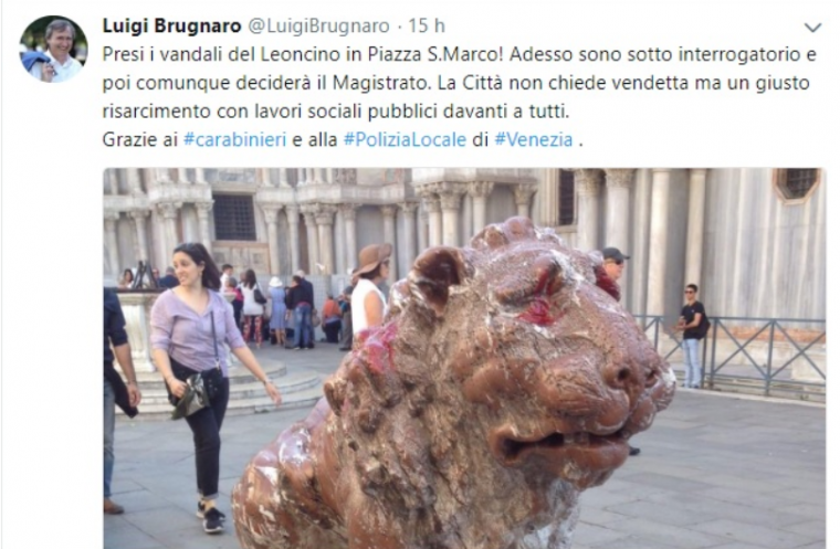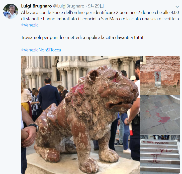 事件发生后,威尼斯市长表态一定会严惩这些暴徒,并让这些破坏分子在全社会前清洗这些狮子。