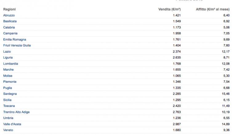 根据2018年8月的数据来看,平均每平米每月租金价格最高的大区宁并不是富庶的北部大区而是热门旅游目的地撒丁岛,每平米平均每月价位高达15.46欧元。经济大区伦巴第则以平均12.08欧的价格位列第四,排在它前面的是拉齐奥大区的12.14欧元和同样为旅游热门目的地瓦莱达奥斯塔大区的14.89欧元。