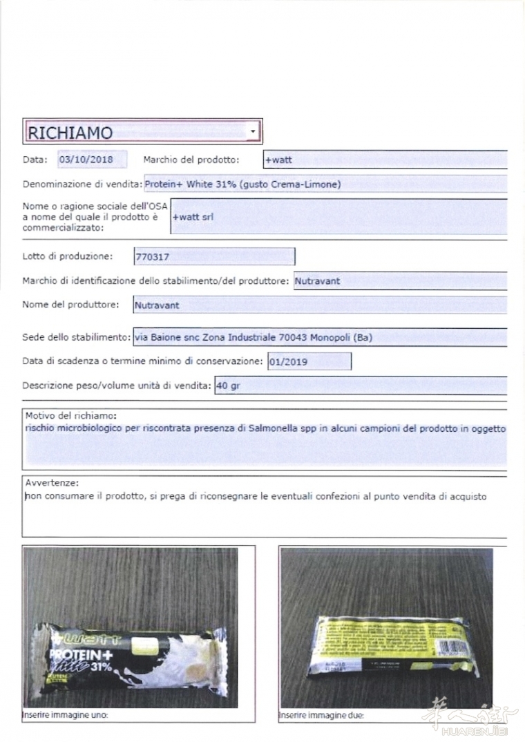 10月03日意大利卫生部门刚刚发布了Bauli羊角面包因查出存在沙门氏菌风险被下令紧急撤回通知,就在Bauli羊角面包被下令撤回的通告当天又有一种干香肠和蛋白棒也存在沙门氏菌问题被找回。