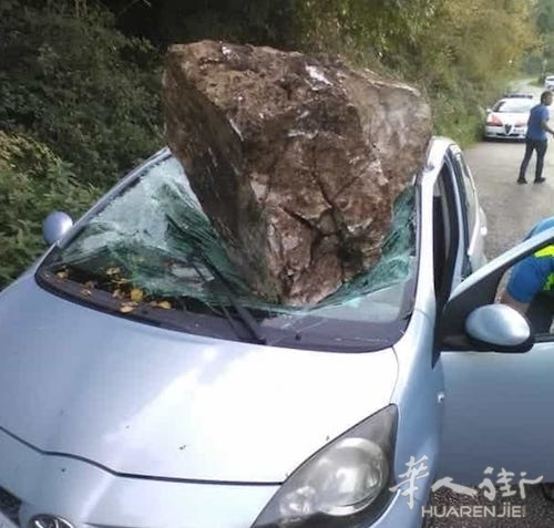 事故发生后消防和救援人员立即赶到现场,发现山体掉落的巨石已经将整辆汽车前挡风玻璃砸毁,且车顶也损坏严重变形。
