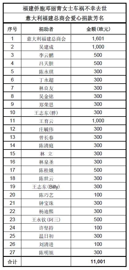 据悉,9月29日邓某在罗马遇车祸并于次日不幸身亡。在驻意使馆领导的努力帮助和正确引导下,吴建成会长先后多次与使馆领导沟通,协助使馆领事保护工作;同时与华人女子丈夫及家属保持密切联系,帮助处理善后出谋划策,为侨胞争取最大权益。意大利侨爱慈善协会和罗马华侨华人联合总会会长胡海锋分别向家属捐款2000欧元和1000欧元。