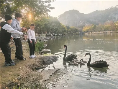 杨府山公园与黑天鹅的缘分始于2014年。当时公园与温州动物园合作,首次引入黑天鹅、鸳鸯、绿头鸭等水禽,成为温州市区首家寄养黑天鹅等水禽类动物的公园。多年来,在良好的生态环境与精心的养护下,园内的“水禽家族”不断繁衍壮大。如今,奥水湖已成为70多位“水禽居民”的和谐家园:漂亮的黑天鹅、成群的大雁、活泼的绿头鸭与赤麻鸭,还有自在栖息的小??(pì tī)……它们共同构成一幅流动的自然画卷,成为市民游客喜爱的公园景观之一。