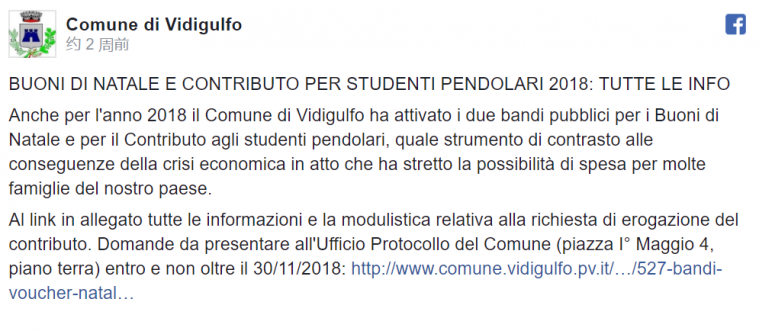 现在,每天从维迪古尔福去帕维亚或米兰去学习或工作的人可以在FACEBOOK上申请奖金。奖金每年将授予一次,维迪古尔福每户家庭最多有两名成员可享受补贴。